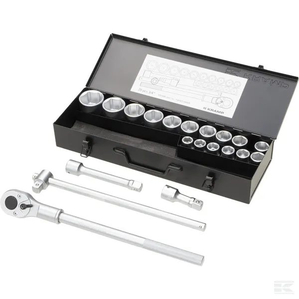Set professionale di chiavi a bussola da 20 pezzi, quadro da 3/4″, con cricchetto reversibile a denti piccoli e varie chiavi in acciaio al cromo-vanadio.